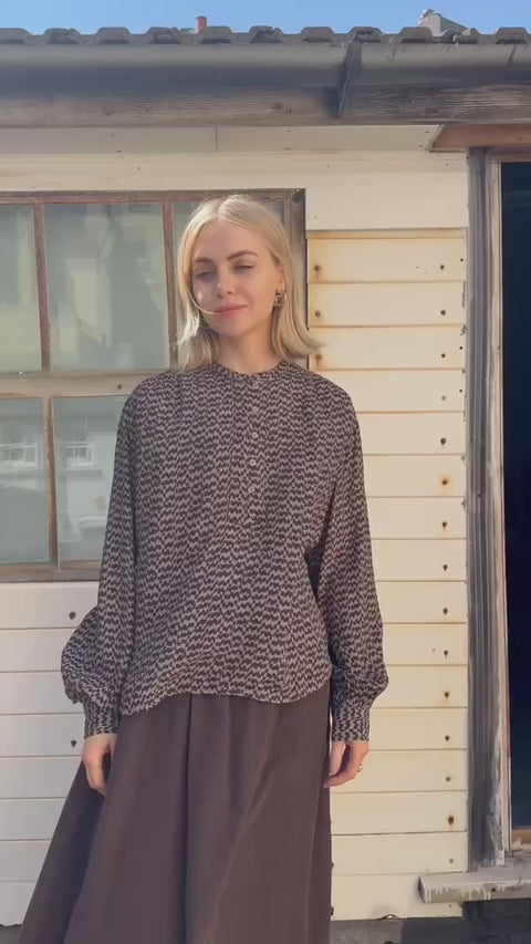 A new wardrobe staple shirt in a digital print design that adds interest but is also easy to wear. A deep chocolate print sits on a greyish coloured background fabric that glides around the body. Style for work with a jacket or waistcoat or for play with your favourite jeans or barrel leg pants. We love this style worn with our Woven 11 knit vests in the cooler months.