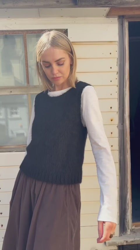 The Sula black handknit vest is crafted by skilled artisans in Peru with soft, delicate finish. Its relaxed fit and classic silhouette make it perfect for layering over shirts, blouses, or dresses.