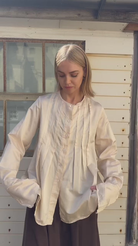 A relaxed shape, collarless shirt. Detailed with pleats through the front body, long sleeves with wide cuffs finished with mother of pearl buttons.