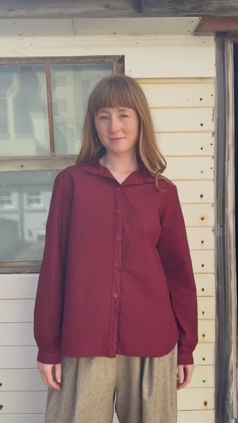We love the rich henna tone of this wearable cotton shirt. Featuring a beautiful cotton lace collar which can be worn both up or down. Pair with any neutrals or black for a sharper look. Can be style both tucked in or worn loose. Styled here with Sula fleece vest and muku trousers.