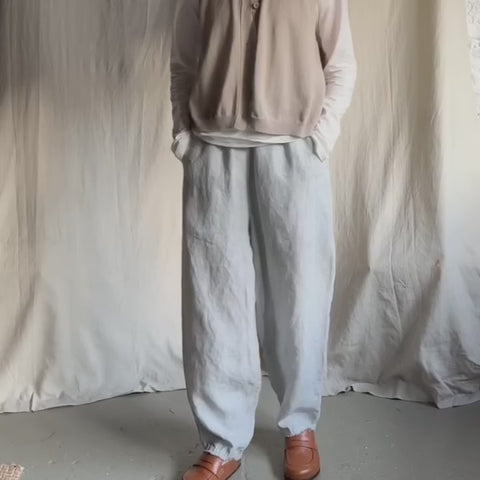 Loose carrot shaped leg pants in a textured linen fabric. Easy pull on design with pockets, fake fly front and signature raw finish to the leg hem which can also be worn rolled up. Pair with the matching jacket for a hard working co-ord or simply style with a Tee and knit vest. These pants are coming up small so we recommend sizing up 1 size for slim fit 2 sizes for baggier fit.