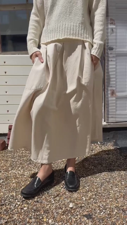 An easy to wear skirt that will take you through most of the year. A flattering flat front was it but with elastic back for comfort. Large tucks from the waist and the perfect mid-calf length. Crafted from cotton drill it has a textures woven finish. Great for work + play. We love it styled with matching chalk colours or contrast with black.